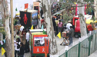 In India, puppeteers from Anurupa Roy’s Kat-Katha troupe entertain the crowd attracted by an ArtMoves display. The auto-rickshaw displays a photograph by South African photojournalist Gideon Mendel, taken at the 2000 World AIDS Conference in Durban, South Africa.