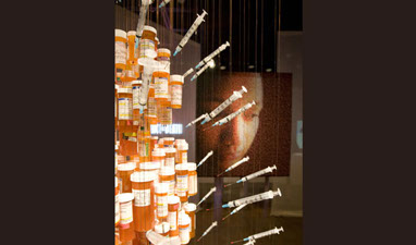 Medicine Man (right) is one of the signature pieces in the internationally touring Not Alone exhibition. It was created by San Francisco artists Daniel Goldstein and John Kapellas with 400 prescription pill bottles.