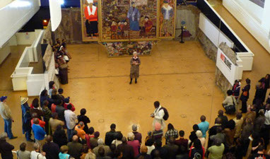 Dr. Carol Hofmyer speaks to the crowd in front of the Keiskamma Altarpiece, part of Not Alone displayed at Museum Africa.