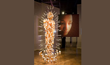 Medicine Man (right) is one of the signature pieces in the internationally touring Not Alone exhibition. It was created by San Francisco artists Daniel Goldstein and John Kapellas with 400 prescription pill bottles.